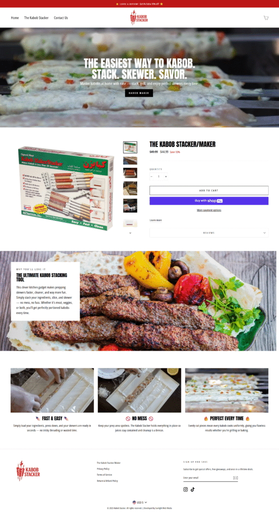 We created a bold, conversion-focused one-product Shopify store for Kabob Stacker — a specialty kitchen tool designed for perfectly stacking skewers. The site features a sleek white-and-red aesthetic, high-impact product imagery, a streamlined “Buy Now” experience, and engaging visuals to showcase the product’s unique value. With integrated reviews, video demonstrations, and social links, the site is built to drive sales and boost brand visibility online.
